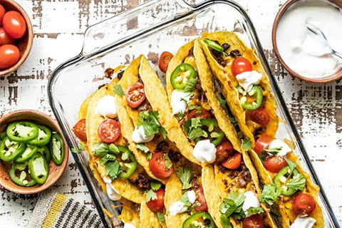 Fill the tacos with the beef and bean mixture. Sprinkle the shredded cheese over top. Bake the tacos in the preheated oven for 7-10 minutes, or until the cheese is melted and the taco shells are golden brown on the edges.