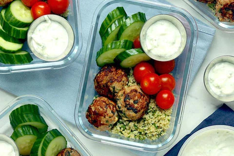 Before serving, transfer the meatballs to a microwave-safe container and heat until steaming. Return to the original container and serve with tzatziki.