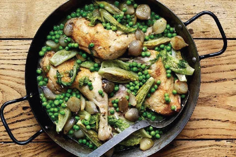 Pour the hot chicken stock into the dish, bring to a simmer, then cover and cook for 30 minutes, until the chicken is cooked and tender.