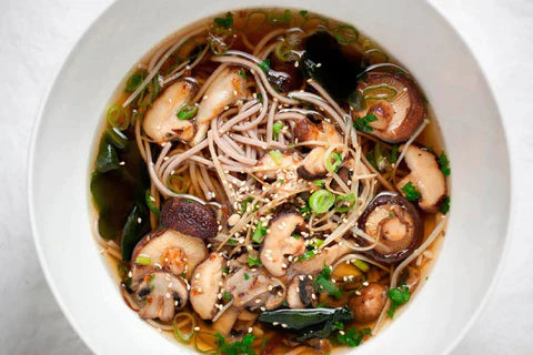 POUR stock over noodles. Add wakame and mushrooms.